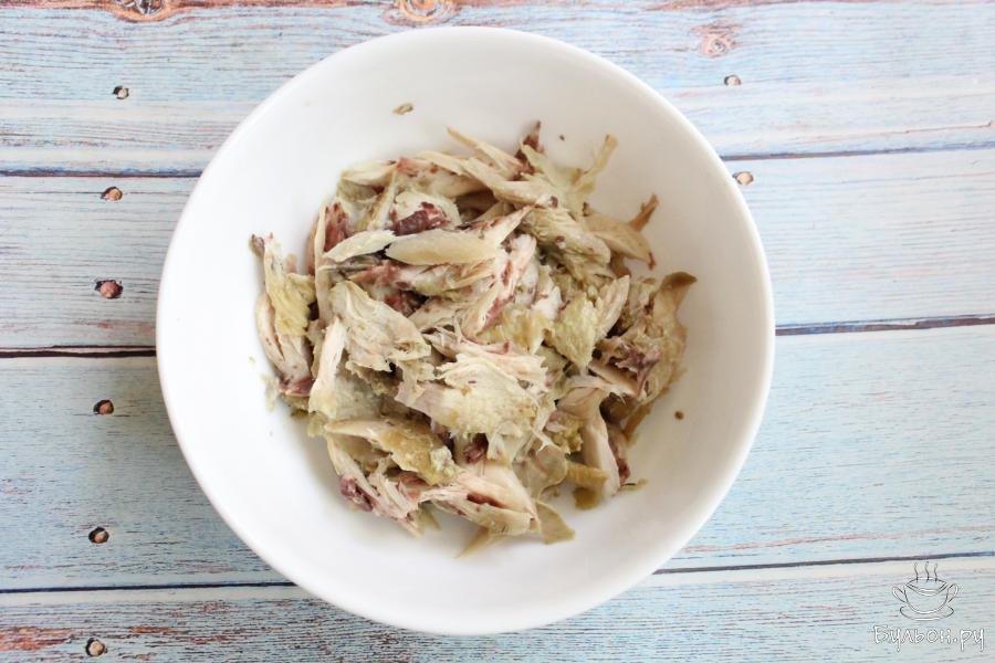 1. Куриное филе отварим до готовности 20-25 минут. Затем куриное мясо нарежем небольшими кусочками или разделим на волокна.