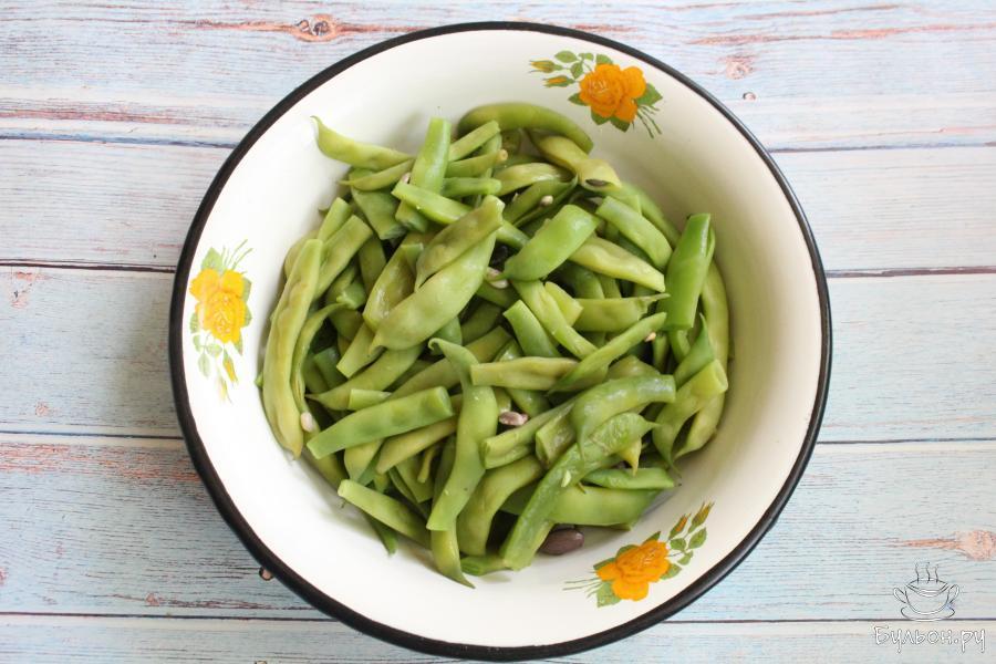 1. Фасоль промоем, срежем "хвостики". Если фасоль крупная, то можно разрезать ее на несколько частей. Отварим фасоль в кипящей воде 5 минут и откинем на дуршлаг.