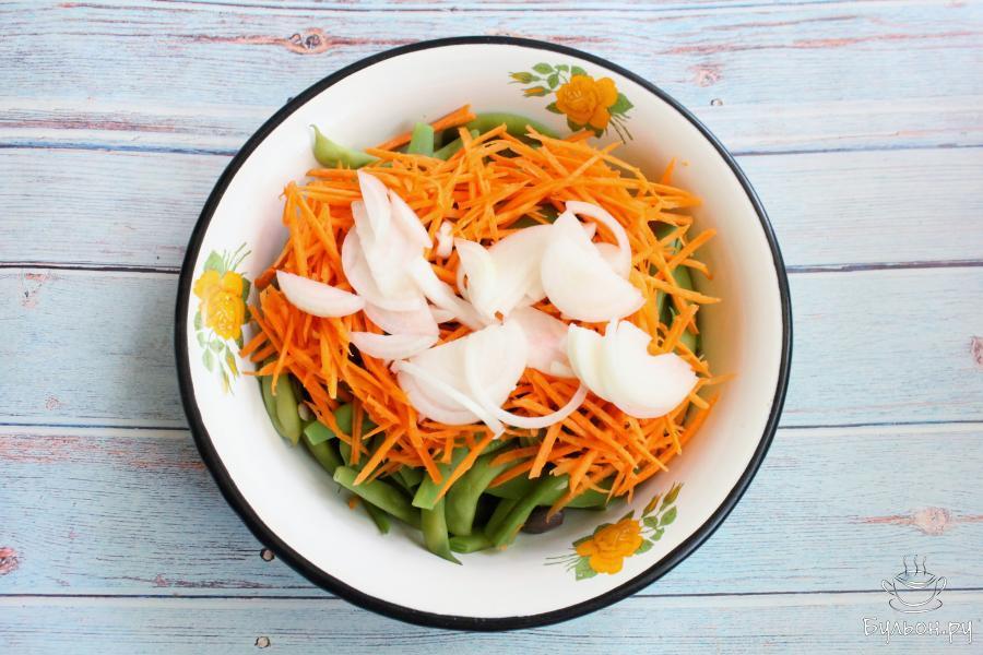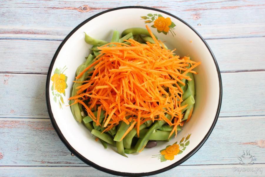2. Морковь почистим, промоем и перетираем ее соломкой, через терку для корейский салатов или через простую крупную терку.