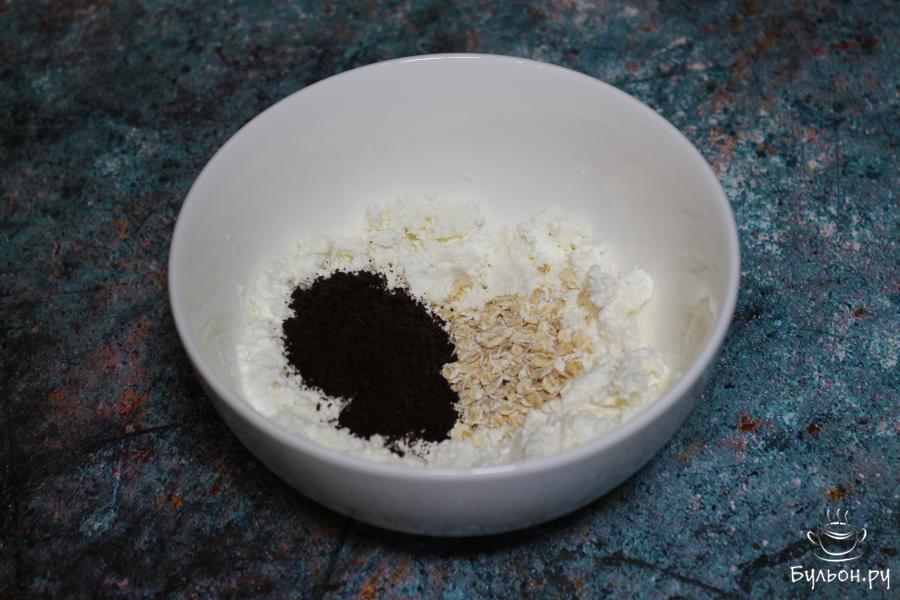 3. Далее добавим овсяные хлопья и измельченное печенье. Я использовала купленное в магазине измельченное печенье орео. Снова все перемешиваем.
