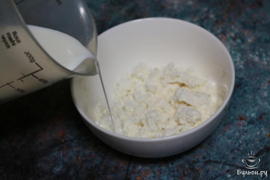 2. Добавим в творог совсем немного молока, лишь для того, чтобы он стал мягче и нежнее, перемешаем их вместе.