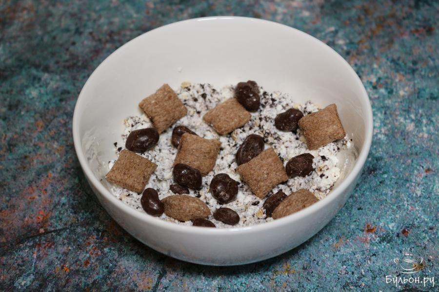 5. На творог выкладываем подушечки с шоколадной начинкой и арахис в шоколаде или обычный. Перед подачей все ингредиенты перемешиваем. Творожный десерт хорошо подавать к чаю.