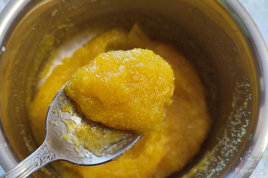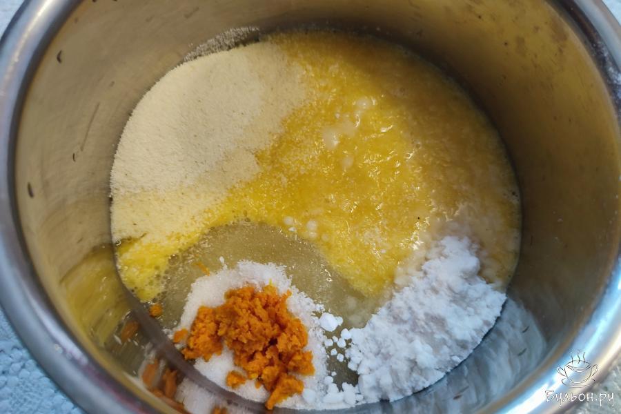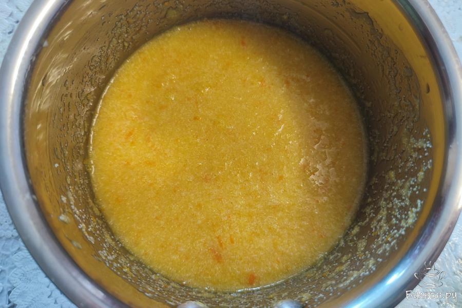 4. В сотейник поместить измельченный апельсин, цедру, манную крупу, картофельный крахмал, сахар и ванилин.