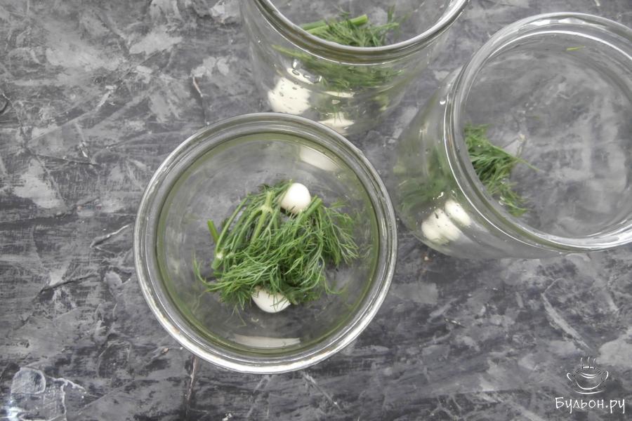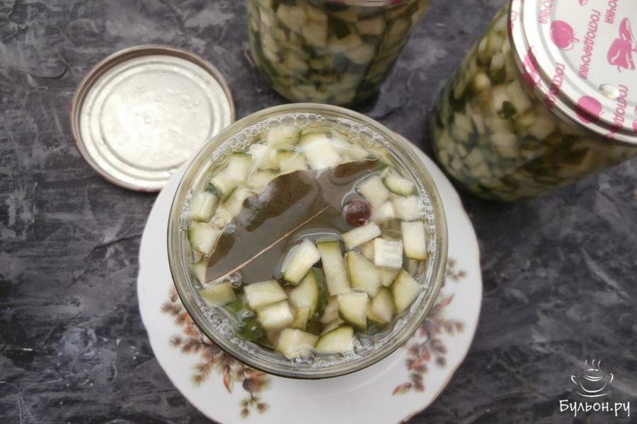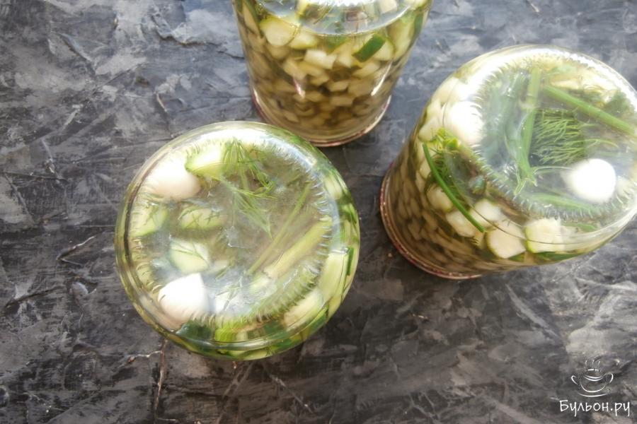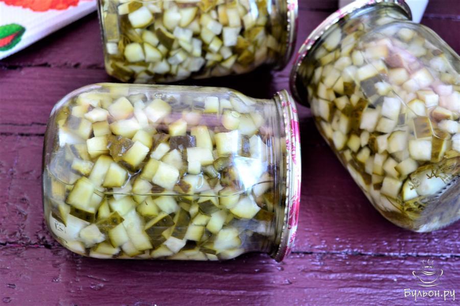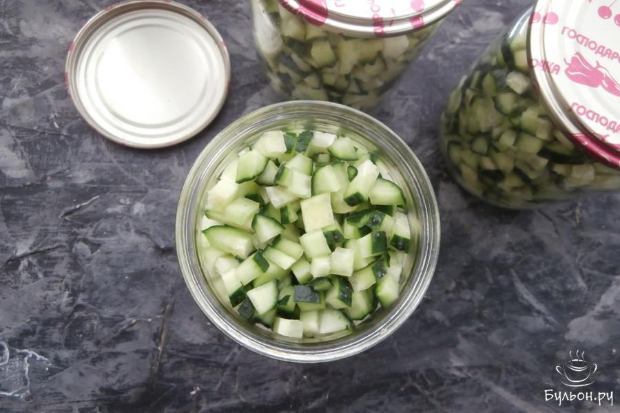 2. Огурцы помыть, нарезать маленькими кубиками и заполнить ими банки поплотнее. Залить все крутым кипятком, оставить, накрыв банки крышками, на 13-15 мин. Воду слить, залить огурчики снова кипятком еще на 8-10 мин. Эту воду также, слить.