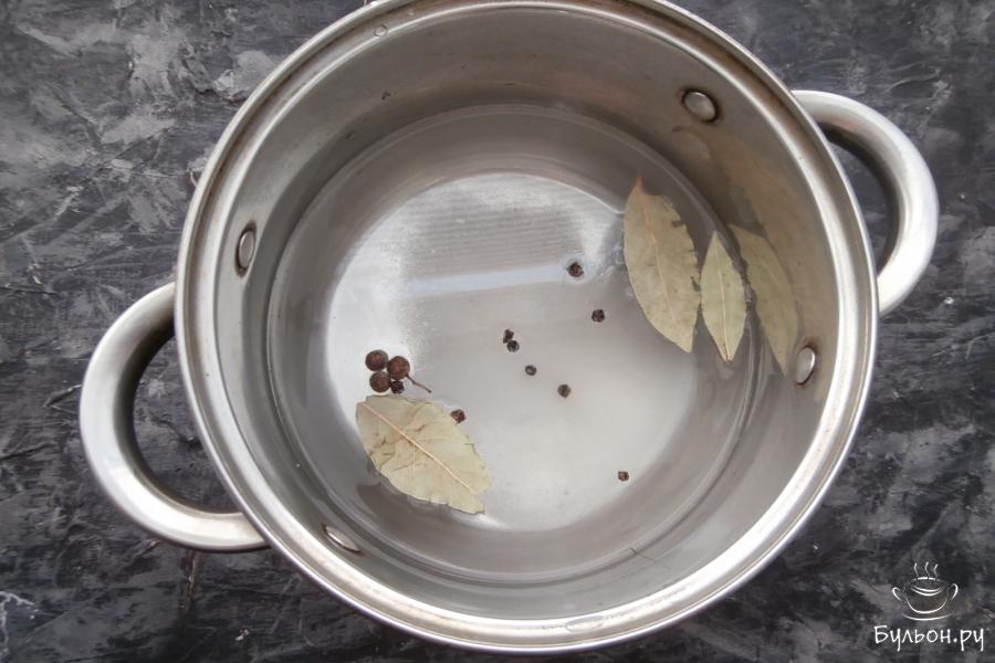 3. Для маринада: 750 мл воды налить в подходящую кастрюлю, добавить 3 ст. ложки сахара, крупную соль (1 ст. ложку), 3 лавровых листика и горошины душистого и черного перцев. Воду закипятить, дать покипеть пару минут.