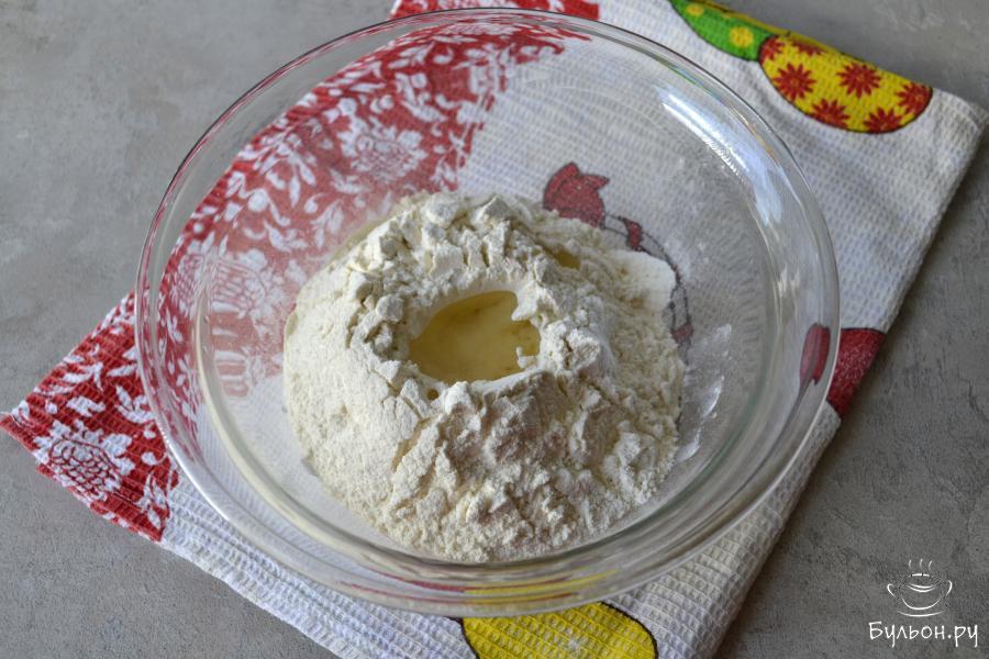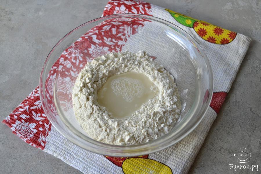 3. Влейте горячую воду. И постепенно, ложкой начните перемешивать муку, начиная от центра к краям миски.
