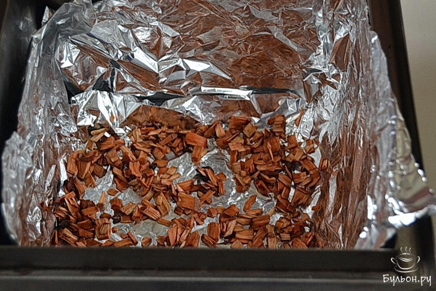 4. Дно коптильни я застилаю фольгой, чтобы легче было чистить после использования. На фольгу выложить щепу. Всего щепы нам понадобится не много - горсточка.