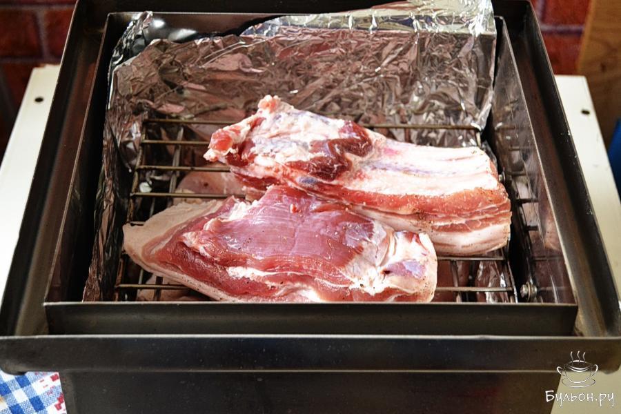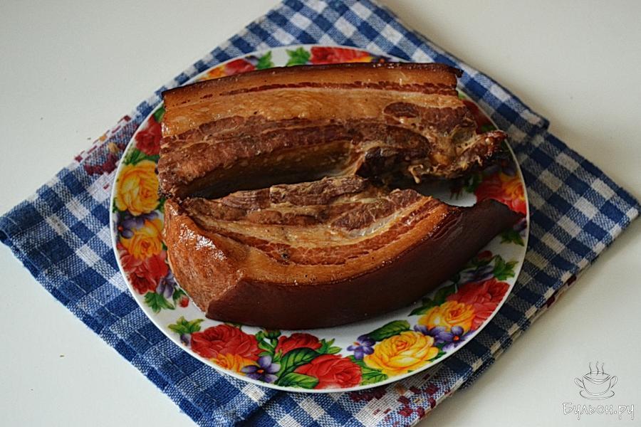 6. От момента выхода дыма засекаем время - 1 час. Ближе к концу готовки можно приоткрывать крышку. Если грудинка становится слишком темной, то копчение можно прекращать. По окончанию крышку открываем через 20 минут, чтобы ушел дым. Кушать копчености можно, спустя 5 часов.