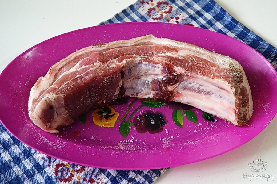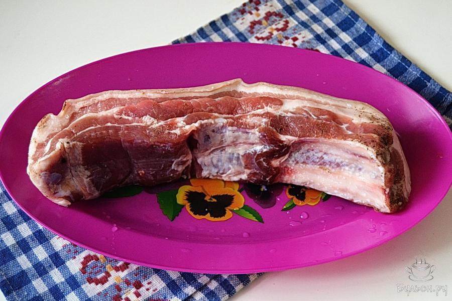 3. После того как свинина просолилась, оботрем кусок мяса тканью и оставим на полчаса, чтобы мясо немного обсохло.