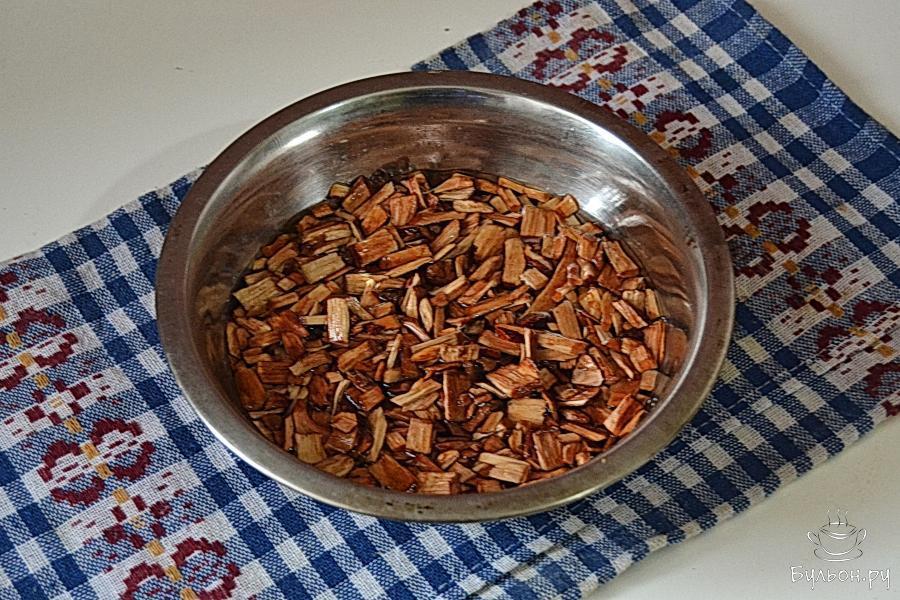 2. Для копчения нам понадобится щепа плодовых деревьев. В этом рецепте используется щепа ольхи, можно также использовать веточки или опилки яблони, абрикоса, сливы, алычи и так далее. Нельзя использовать щепу хвойных деревьев. Щепу намочить, чтобы она медленнее сгорала, но давала больше дыма.