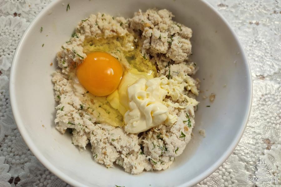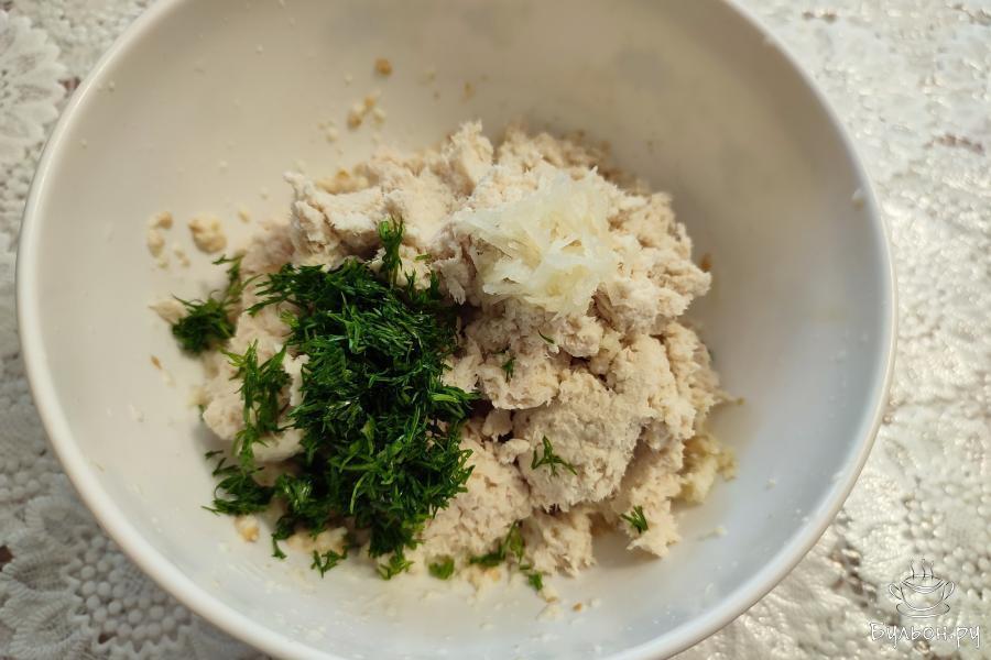 5. В миске соединить мясо, хлеб, мелко нарезанный укроп, натертый на крупной терке лук и соль. Перемешать.