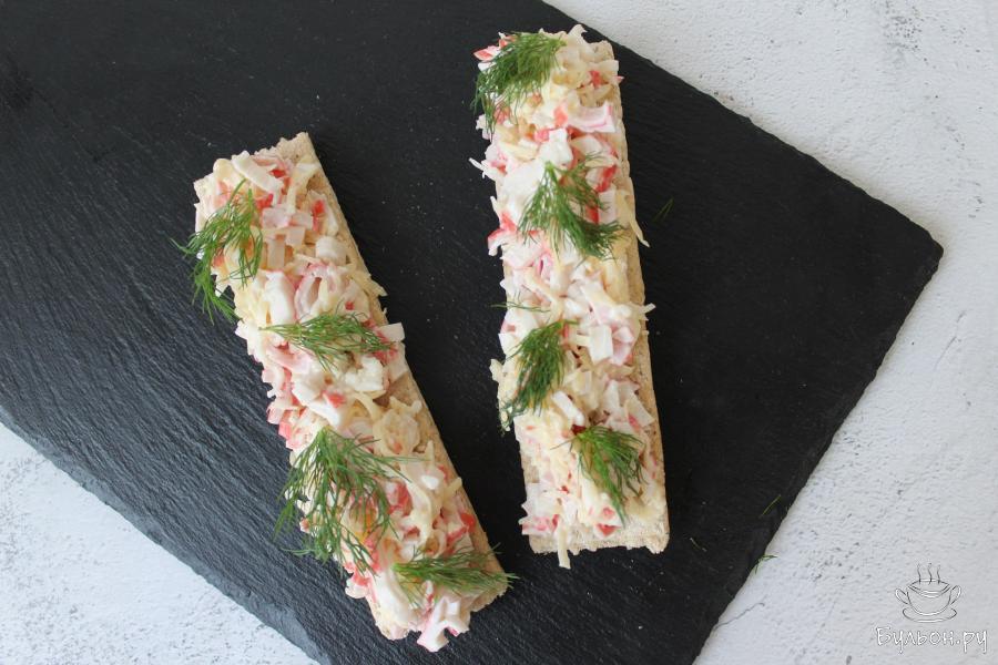 6. Возьмите хлебы, выложите на них крабово-сырную начинку и украсьте мелко нарубленной зеленью. Поскольку хлебцы имеют свойство обмякать, подавайте такую закуску на стол сразу после приготовления.