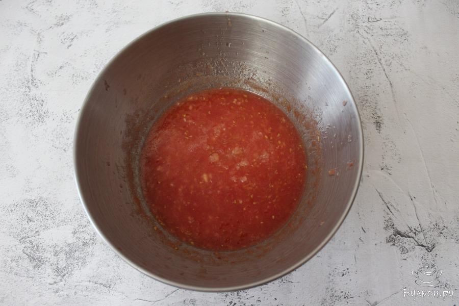5. Нарезанные помидоры и очищенные зубчики чеснока пропускаем через мясорубку с крупными отверстиями. В перемолотую томатно-чесночную массу добавим соль и сахар, хорошо перемешиваем.