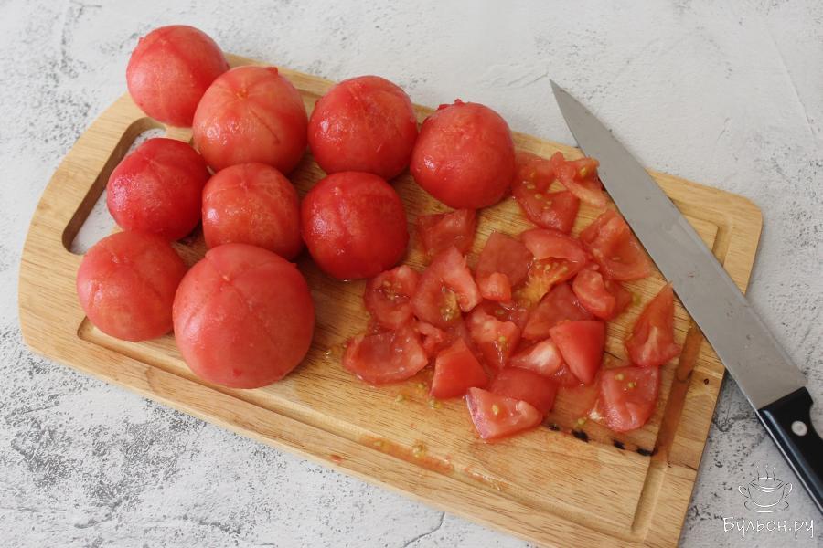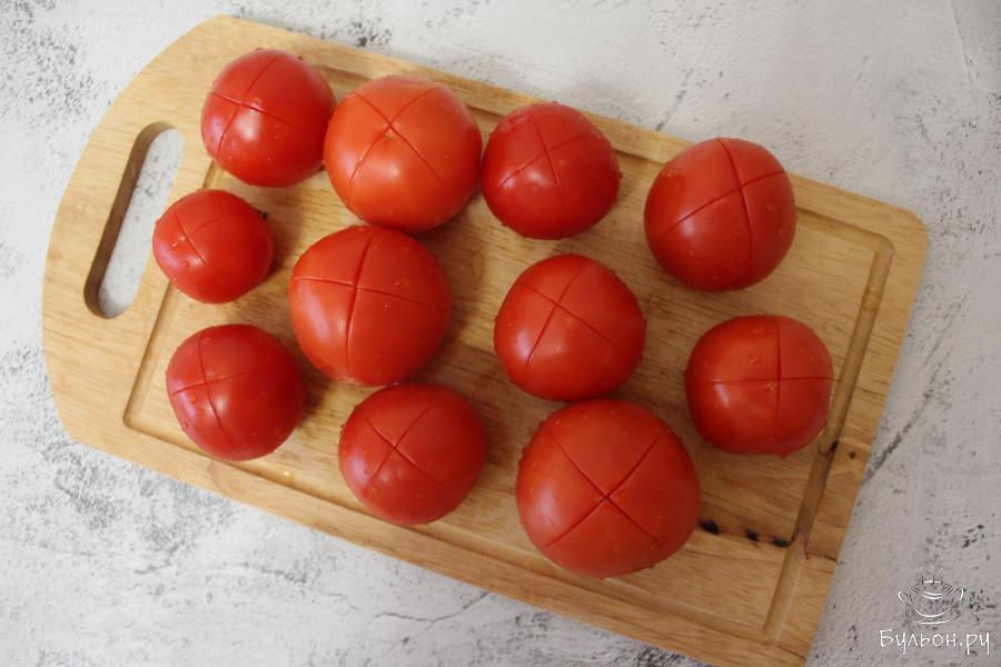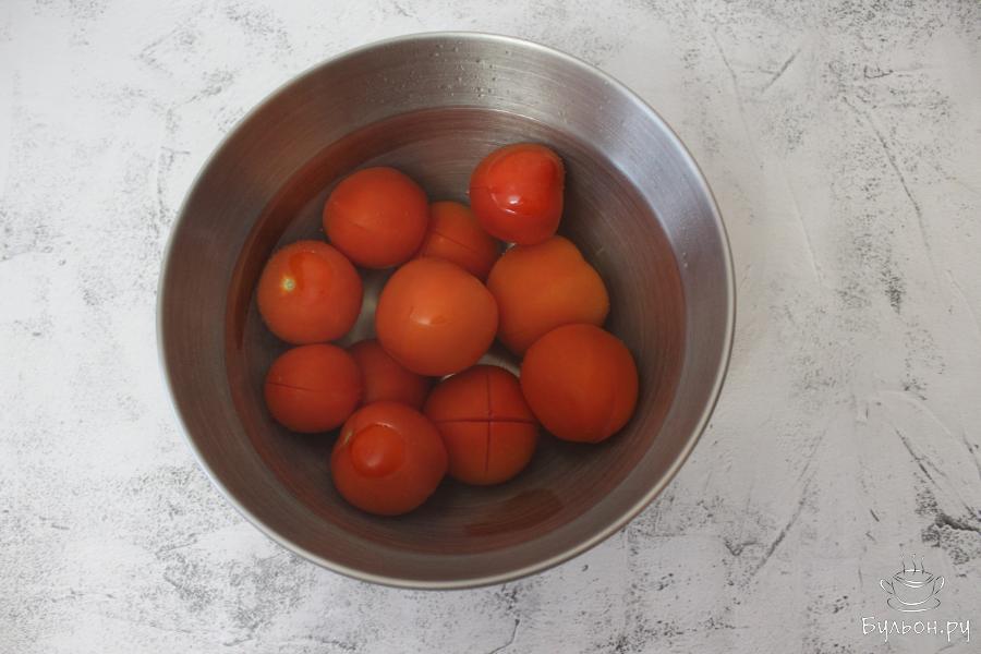 2. Опускаем помидоры в кипяток, буквально на пару минут, после чего перекладываем в емкость с холодной водой. С помощью такого контраста, кипятка и холодной воды, кожура с помидор с легкостью снимется.