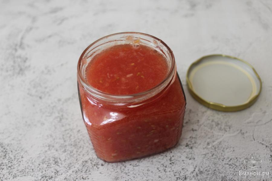 7. Объем чистого соуса составил 800 гр., но эта цифра ориентировочная. Количество горлодера зависит от сочности и мясистости выбранных помидор.