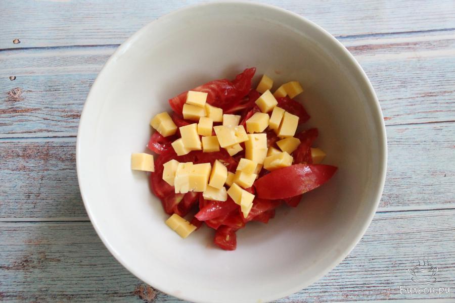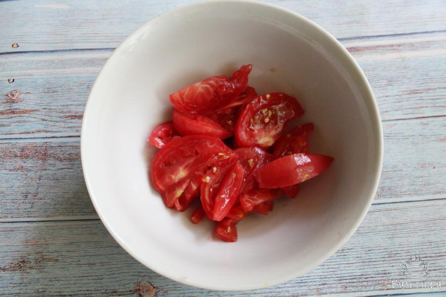 2. Пока варятся яйца, помидоры промоем, нарежем их крупными дольками. Кладем помидоры в глубокую салатницу.