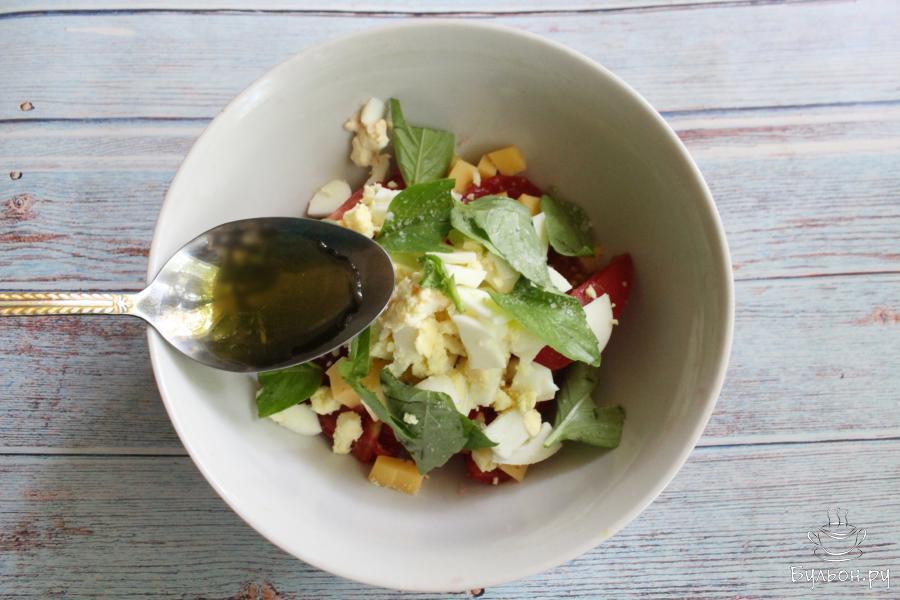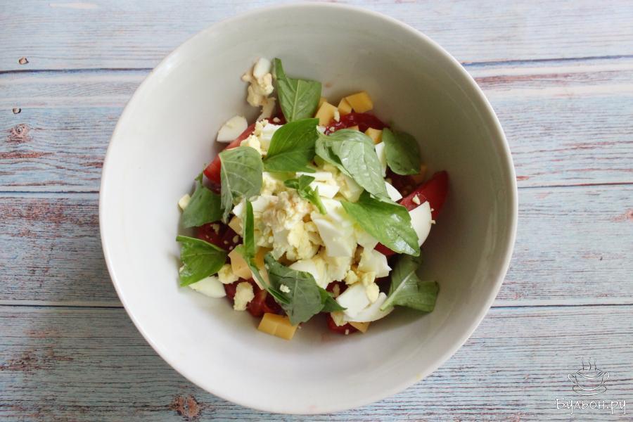 Салат с помидорами, сыром и яйцом отлично подходил к завтраку, обеду или даже можно перекусить порцией такого салата в течение дня. Салат готовится быстро и просто. Этот салат порадует вас своим ароматом, сочностью и ярким цветом. Для приготовления салата подойдет любой твердый сыр, который вы любите. Базилик можно использовать фиолетовый, но с зеленым базиликом у салата получается более тонкий аромат. По желанию, в салат можно добавить и другую любимую зелень.
