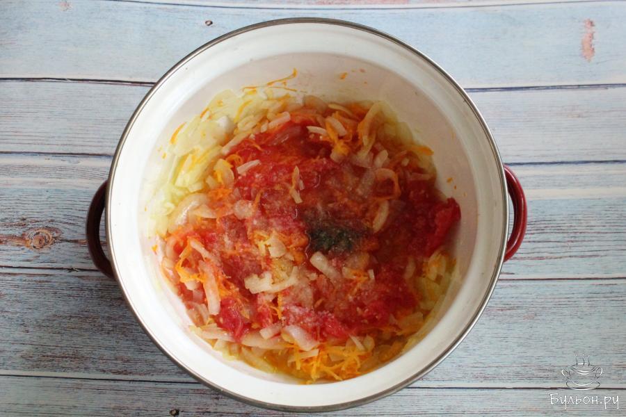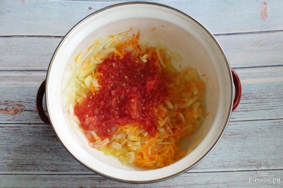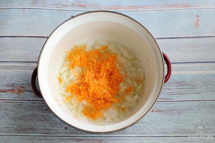 4. Морковь почистим, промоем, перетираем морковь через мелкую терку. Добавляем морковь к луку и тушим все вместе пару минут. Помешиваем.