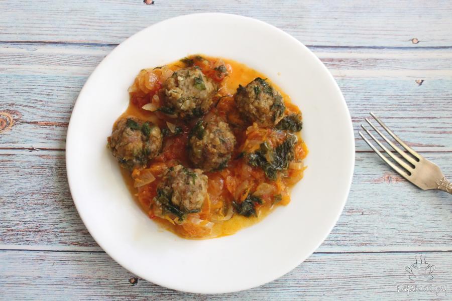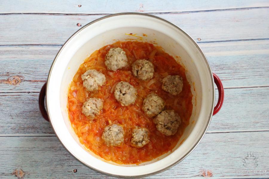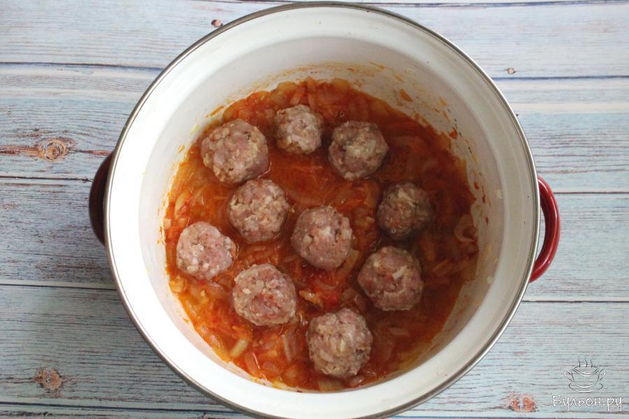 8. Выкладываем фрикадельки к овощам, добавляем воду. Если вы любите жидкие подливы, то количество воды можно увеличить до 400 мл.