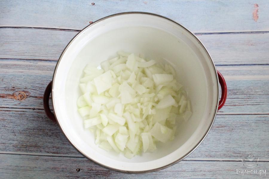 3. Лук почистим, промоем, мелко нарежем. В кастрюльку наливаем масло, выкладываем лук и тушим его 4-5 минут. Если вы любите жареные овощи, то это блюдо вполне можно готовить на сковороде и все обжаривать.