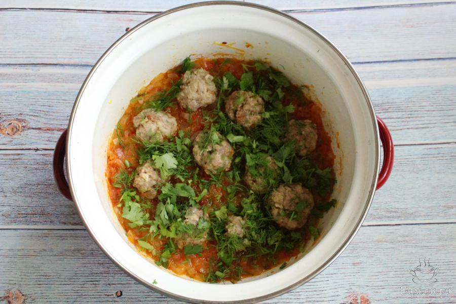 10. Затем добавляем к фрикаделькам измельченную зелень. Готовим фрикадельки еще 10 минут под крышкой.