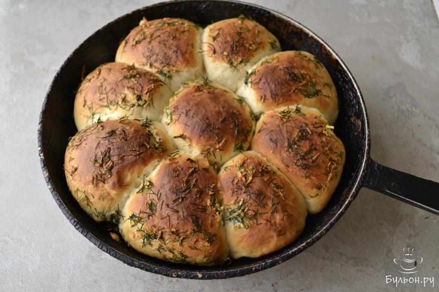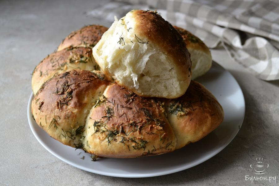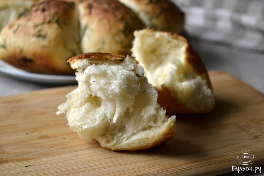 Чтобы разнообразить выпечку домашнего хлеба, испеките отрывной хлеб на кефире с чесночно-укропной заливкой в форме "ромашки". Получается даже не хлеб, а красивый пирог с ароматом укропа и чеснока. Укроп лучше использовать свежий, чеснока будет достаточно 2-3 зубчика. Выпекать хлеб нужно в круглой форме или в сковороде, подходящей для выпечки в духовке. Испеченный хлеб лучше не нарезать, а отламывать.
