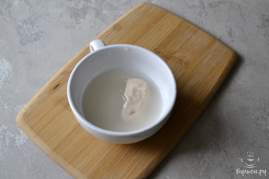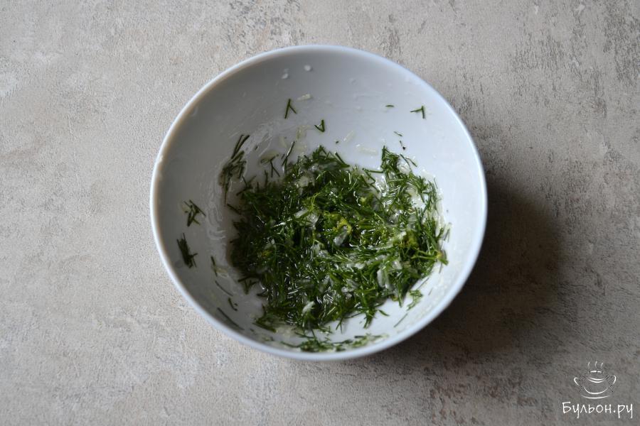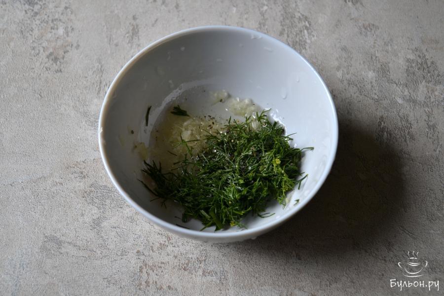 10. Для заливки: в небольшую мисочку влейте растительное масло (2 ст. л.), положите нарезанный свежий укроп и пропущенный через пресс чеснок.