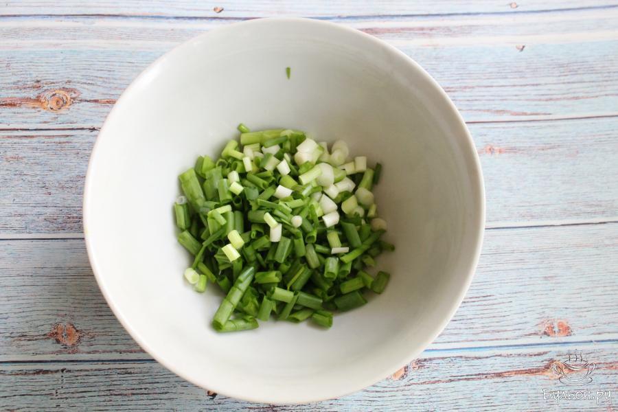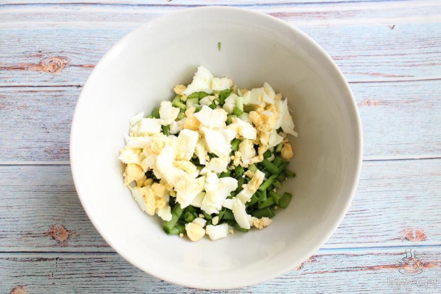 6. Яйца сварим вкрутую, 10 минут после закипания воды. Почистим яйца и нарежем мелкими кубиками, добавим к луку.