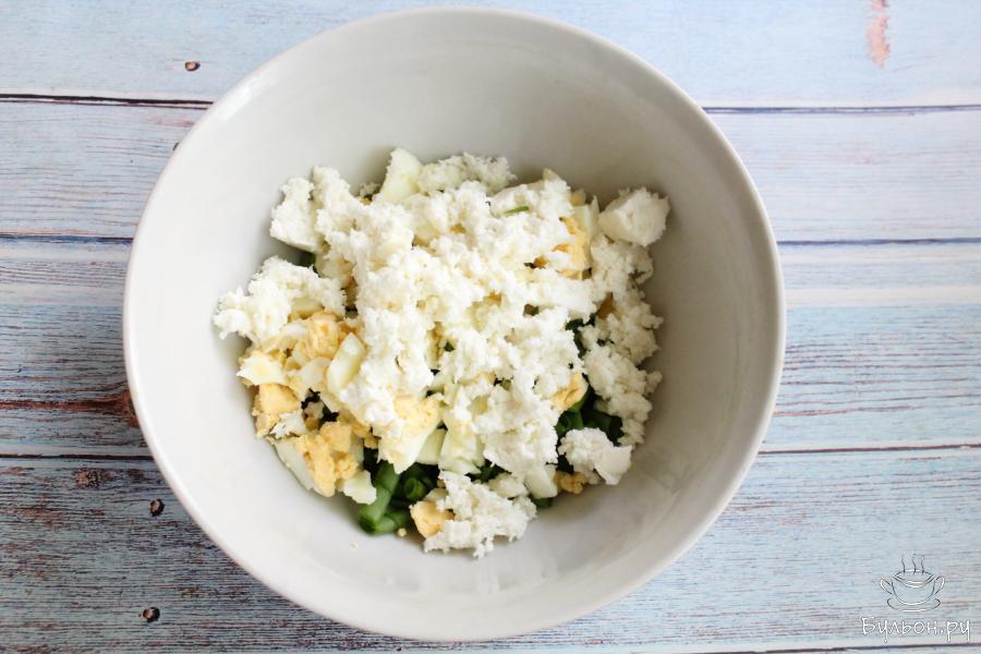 8. Добавим в начинку черный перец и если брынза пресная, то начинку можно посолить. Перемешиваем начинку.