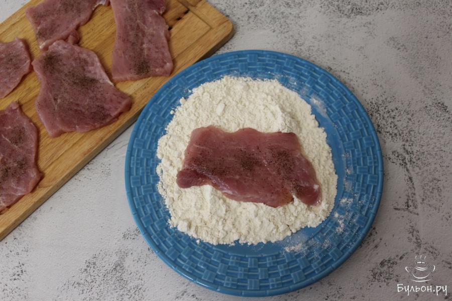 1. Свиной карбонад промоем под водой, просушим бумажными полотенцами и нарежем на порционные куски (стейки). Каждый кусок отобьем кухонным молотком с двух сторон.