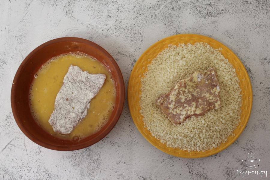 3. Затем свиную котлету опустим во взбитое яйцо и сразу же запанируем в сухарях панко. У меня были яйца категории С2, если будете использовать яйца категории С0, вам вполне хватит одного яйца.
