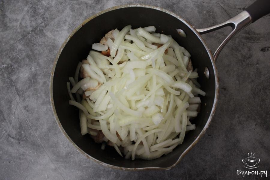 3. Когда мясо будет обжарено, добавим в ковшик лук, нарезанный полукольцами. Помешивая мясо с луком, будем жарить еще 5 минут.