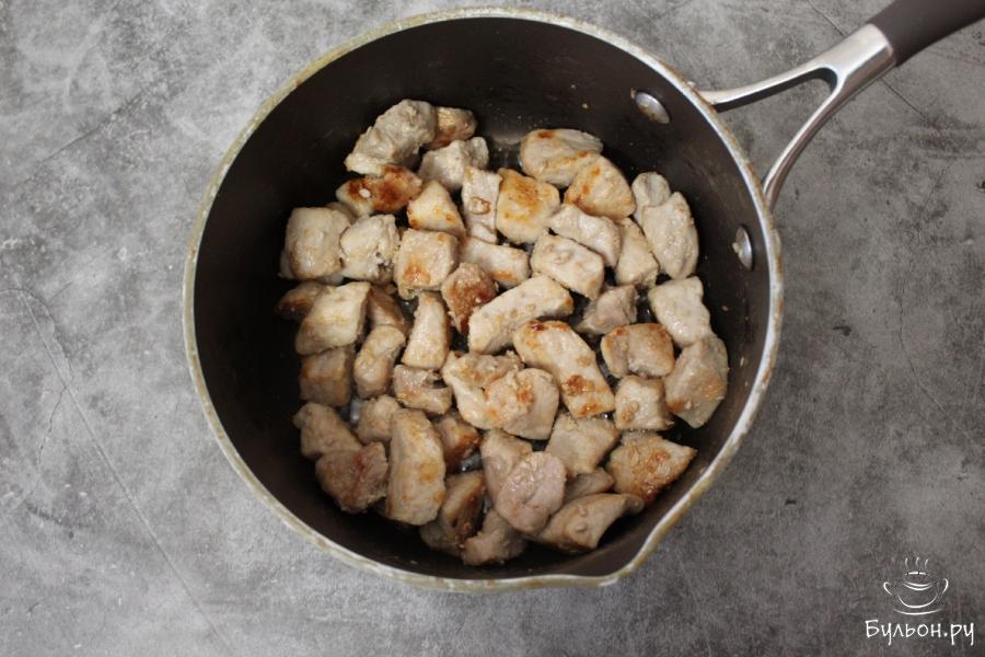 2. Обжарим мясо в ковшике до образования легкой румяной корочки, добавив немного рафинированного масла.