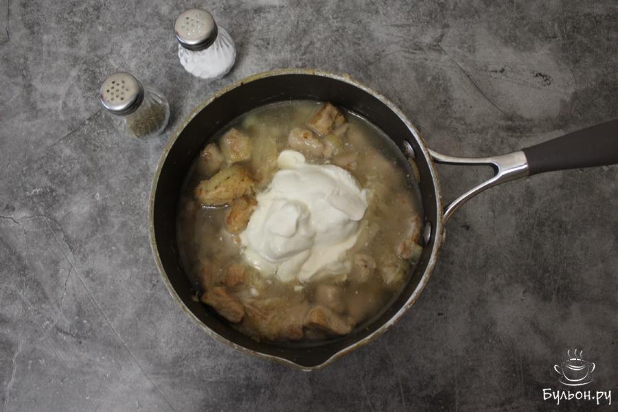 5. К мясу добавим сметану, соль, перец, вольем воду и будем тушить под закрытой крышкой примерно 10 минут.
