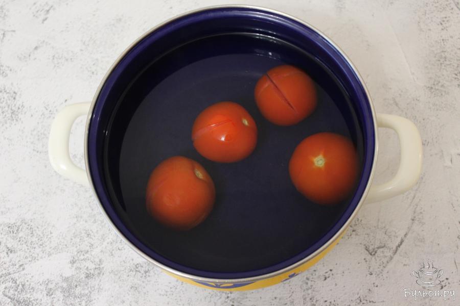 5. Вымытые помидоры, сверху, надрезаем крестообразно и заливаем кипятком, даем полежать в течение 2-3 минут. Затем сливаем кипяток и заливаем холодной водой. Теперь с легкостью снимаем с помидор кожицу.