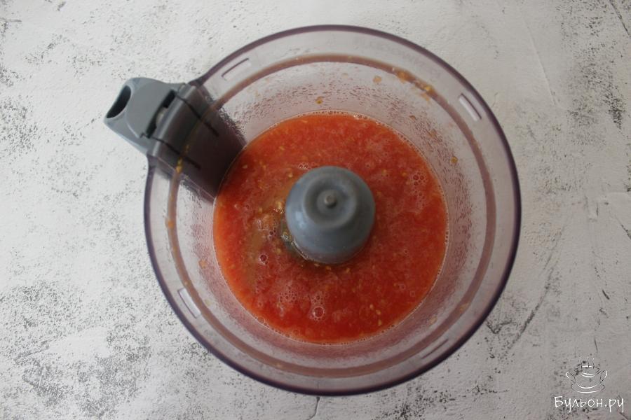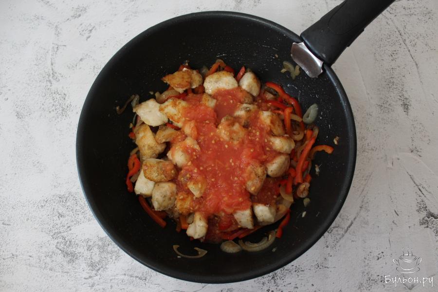 8. Выкладываем к овощам курицу, заливаем перетертыми томатами и добавляем воду, слегка подсаливаем и перчим. Закрываем крышкой и тушим 25 минут.