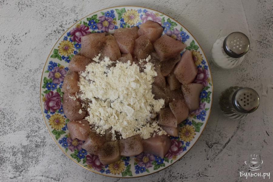 1. Промытое куриное филе нарезаем крупными кусочками, солим, перчим, посыпаем пшеничное мукой и рукой перемешиваем, чтобы каждый кусочек курицы был обвален в мучной панировке.