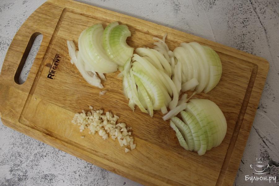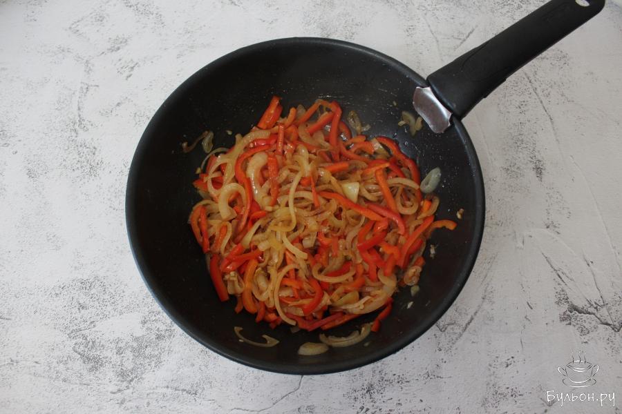 7. На сковороде обжариваем лук с чесноком до легкого золотистого цвета, затем добавляем перец и продолжаем жарить еще 5 минут.