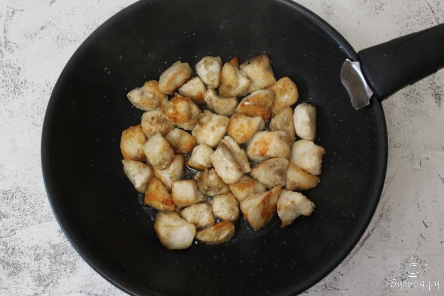 2. На растительном масле, до золотистого цвета, обжариваем запанированные кусочки курицы. Готовые кусочки перекладываем на чистую тарелку, поскольку в этой же сковороде мы будем готовить овощи.