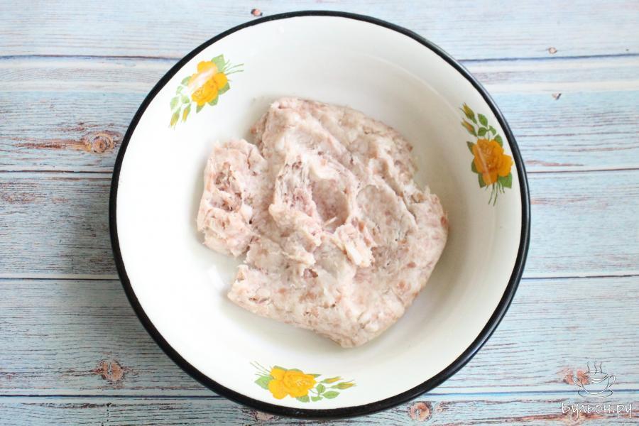2. Если фарш готовый, то размораживаем его. Если фарша нет, то прокручиваем свинину с жирком через мясорубку с мелкой решеткой.