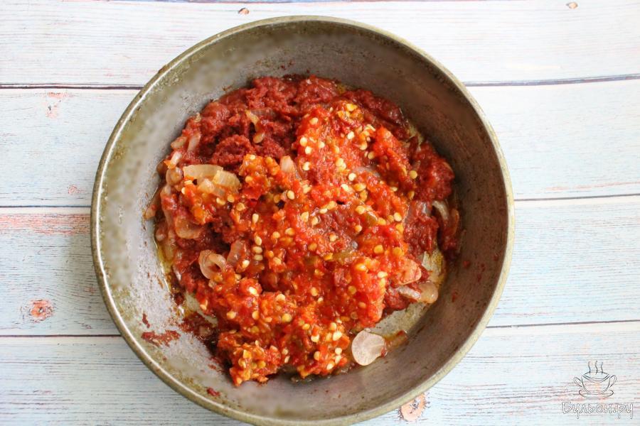 3. Перец моем, крутим через мясорубку, выкладываем на сковороду и тушим на небольшом огне 5-6 минут. Помешиваем.