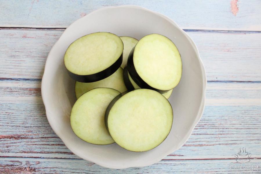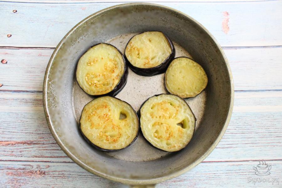 2. Обжарим баклажаны на сковороде с разогретым маслом по 2-3 минуты с каждой стороны. Отставим сковороду с огня, накроем крышкой и оставим баклажаны на пять минут.