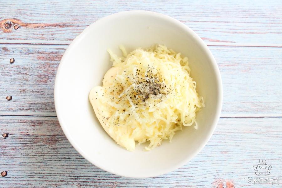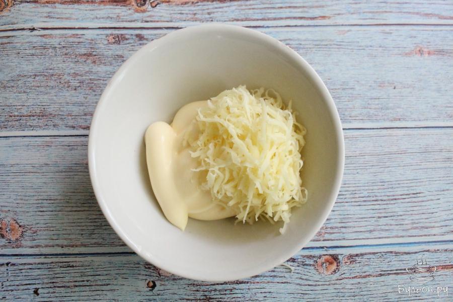 3. В глубокой миске подготовим ингредиенты для соуса. К майонезу добавим сыр, перетертый через мелкую терку.