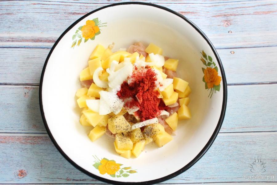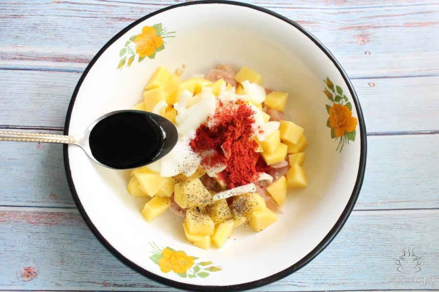 4. Добавим сладкую паприку, черный перец и немного соли. Если у вас соевый соус сильно соленый, то соль не понадобится.