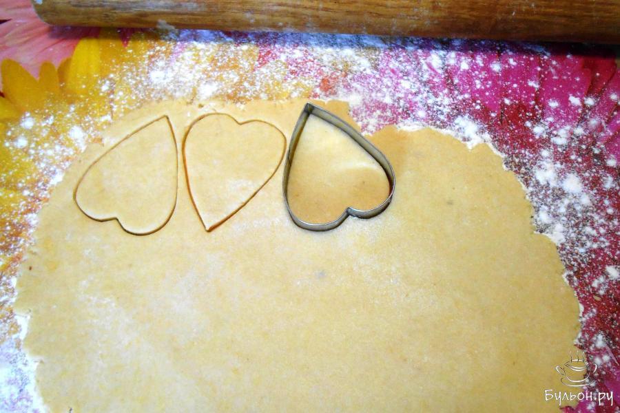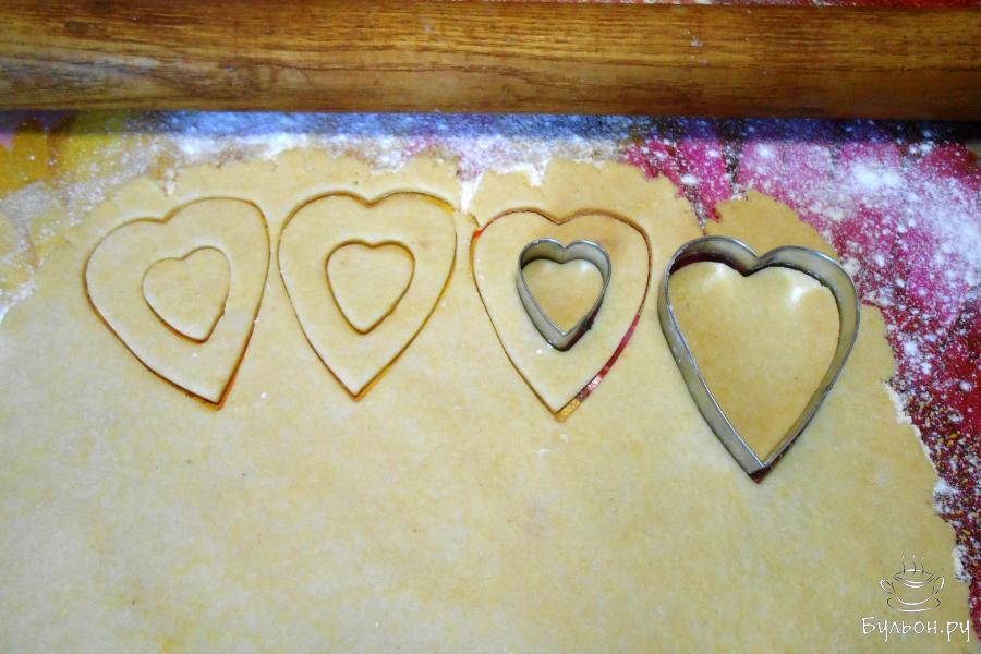 8. Вторую часть теста раскатать и вырезать такое же количество больших сердец, формой для печенья меньшего размера вырезать серединку. Получились ободки.