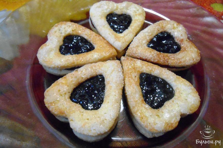 Красивое и очень нежное песочное печенье ко дню святого Валентина, сделайте вкусные валентинки в подарок любимым. Тесто получается рассыпчатое и не сильно сладкое. Маргарин используем комнатной температуры. Понадобятся две формы для печенья в виде сердца, большая и маленькая. Джем можно использовать любой, главное чтобы он был густой. Я выбрала джем из смородины.