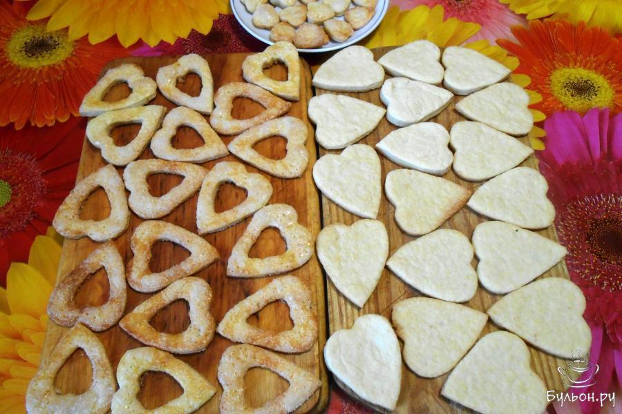 11. Выложить ободки и маленькие сердечки на противень, застеленный пергаментом. Выпекать при температуре 180 градусов 10 минут.