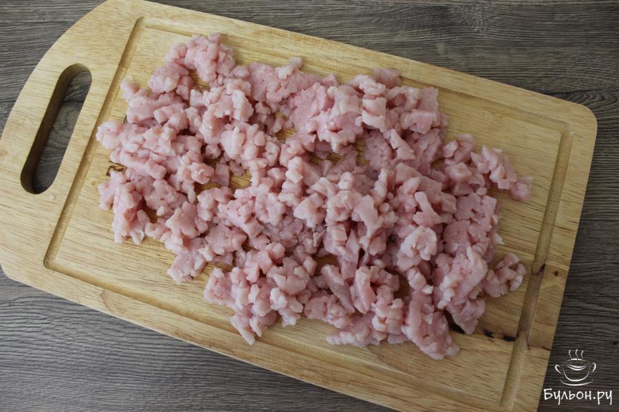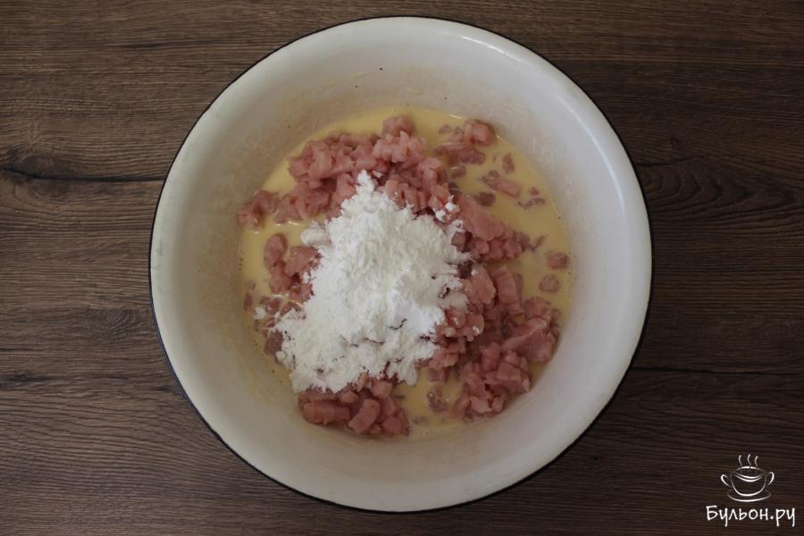 3. Переложите рубленное мясо в яичную смесь, всыпьте кукурузный крахмал и перемешайте. Консистенция массы с мясом может получится достаточно жидкой, не переживайте, при жарке масса схватится.
