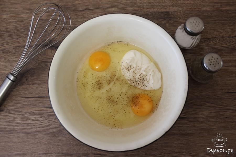 1. В глубокую миску вбейте яйца, добавьте соль, перец и майонез. Взбивайте яичную массу венчиком в течение 2 минут.
