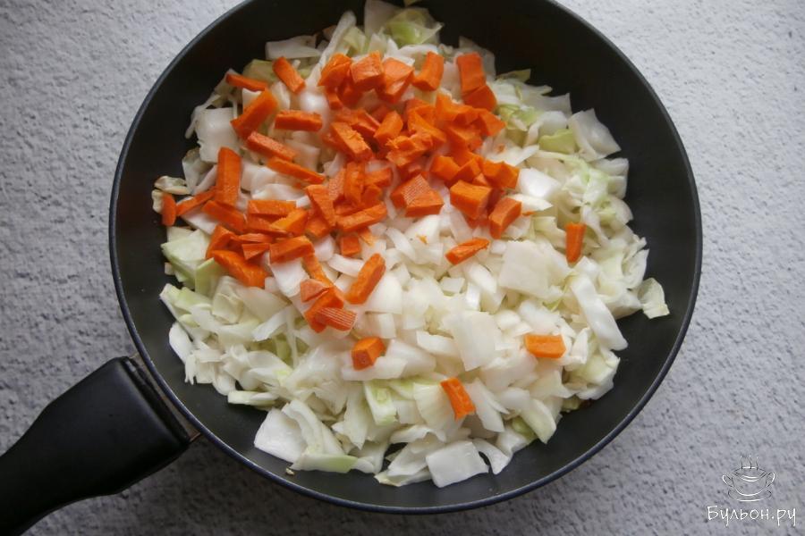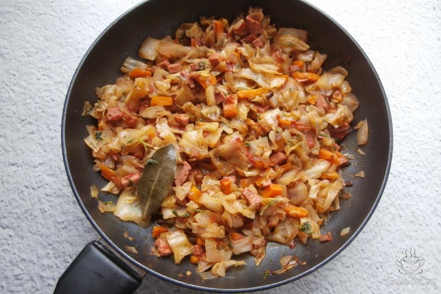 3. Обжарить все в течение 5 мин., добавить порезанные кубиками колбасу и помидоры, всыпать соль, сахар, черный и красный молотый перец и приправу. Добавить лавровый лист.